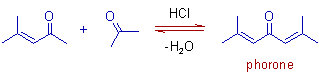 The mesityl oxide may further condense with another molecule of acetone to give phorone.