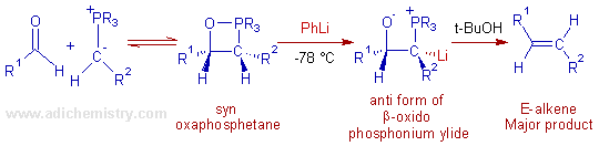 Stereochemical perspective: Both syn and anti diastereomeric oxaphosphetanes are possible. However the formation of oxaphosphetane is stereoselective depending on the conditions.
