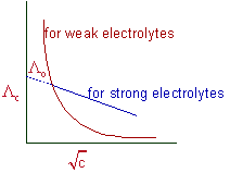 However the equivalent conductivity of weak electrolytes increases steeply at very low concentrations (see the above graph) and hence their limiting values (Λo) cannot be determined by extrapolating the Λc to zero concentration.