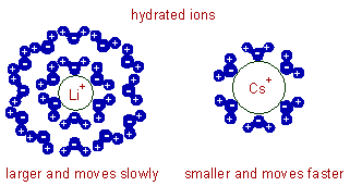 * However, in aqueous solutions the extent of hydration affects the mobility of the ion, which in turn affect the conductivity. Heavily hydrated ions show low conductance values due to larger size.
